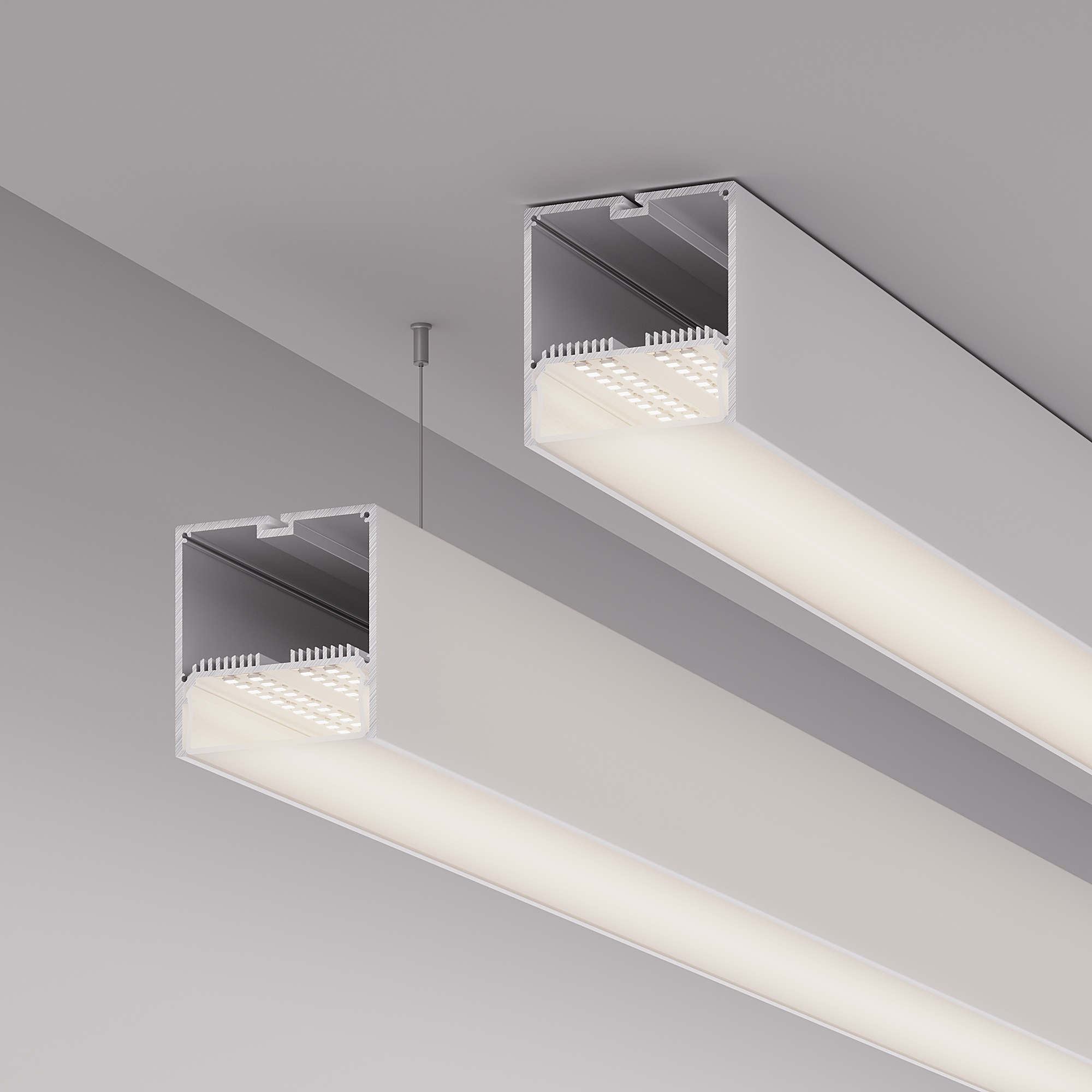 Подвесной/накладной профиль белого цвета из алюминия с отсеком для блока питания (70х40 мм) в комплекте с матовым рассеивателем из поликарбоната со светопропусканием 65% и заглушками идеально подходит для основного освещения и контурной подсветки.