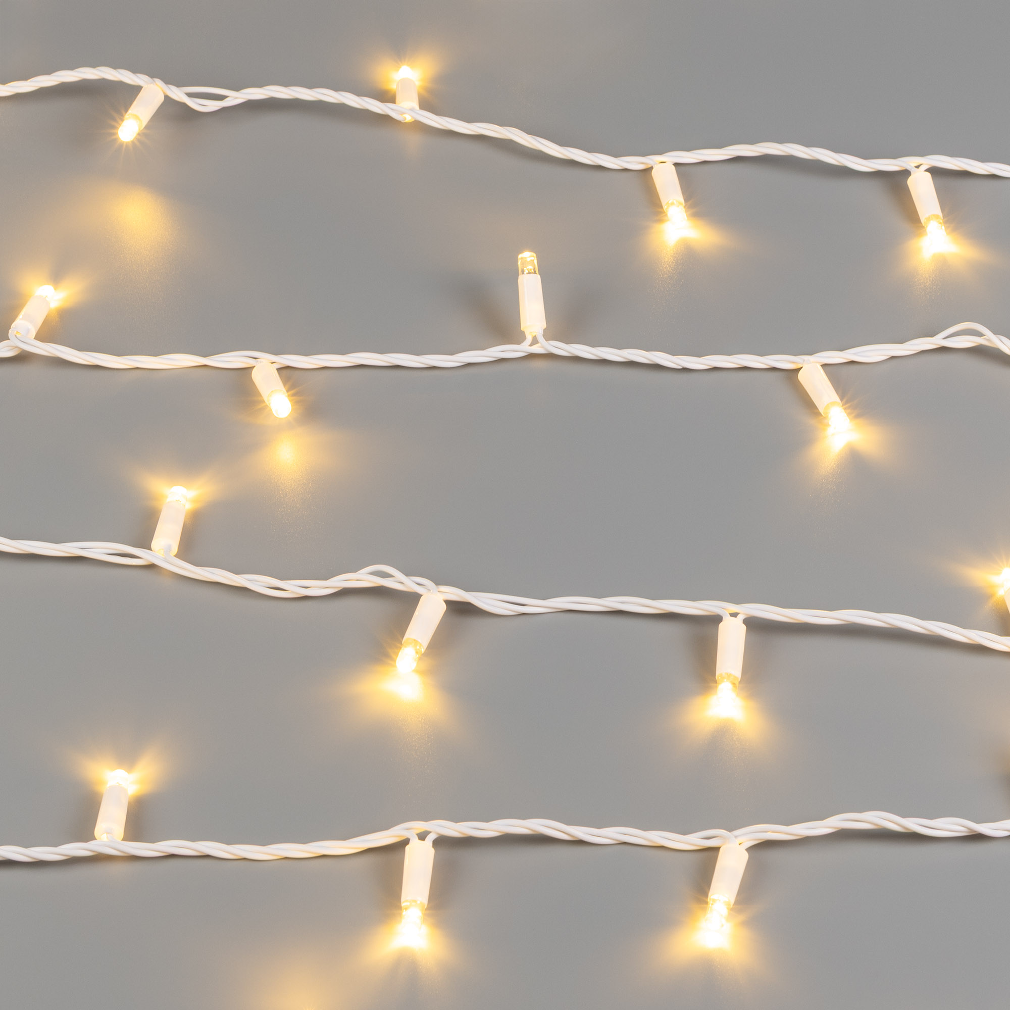Светодиодная нить Classic. Размер 10000 мм. Цвет свечения ТЕПЛЫЙ БЕЛЫЙ (3000 К). 100 светодиодов размером 7 мм со статическим эффектом свечения с резким световым рисунком (прозрачная вогнутая линза). Провод белый, ПВХ. Питание 230 В, Мощность 7 Вт, защита IP65, применение в помещении и на улице под навесом. Аксессуар для подключения приобретается отдельно.
