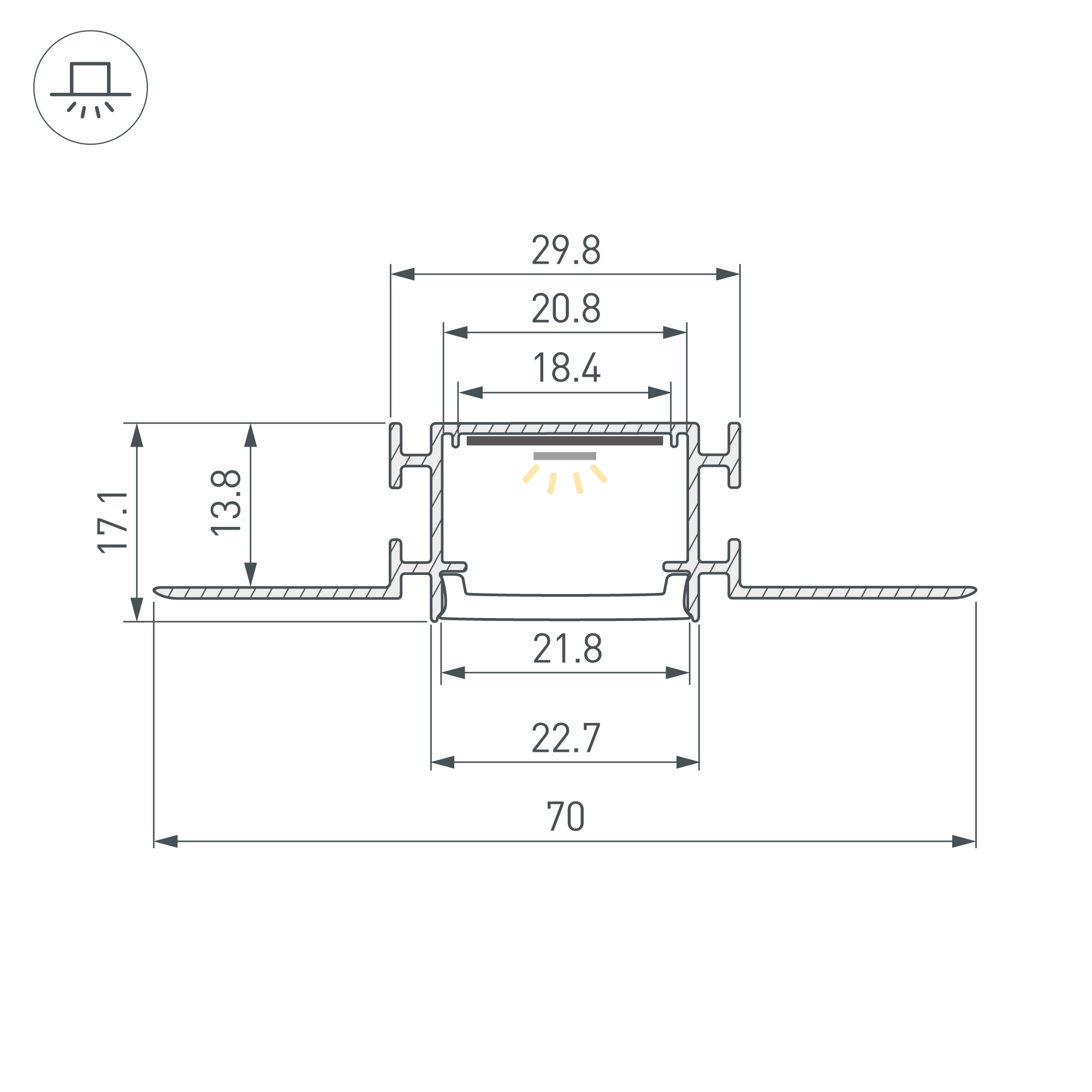Габаритные размеры профиля составляют 2000 мм в длину, 70 мм в ширину и 17,1 мм в высоту. Площадка для установки светодиодных лент позволяет использовать ленту шириной до 17 мм и мощностью до 23 Вт/м.