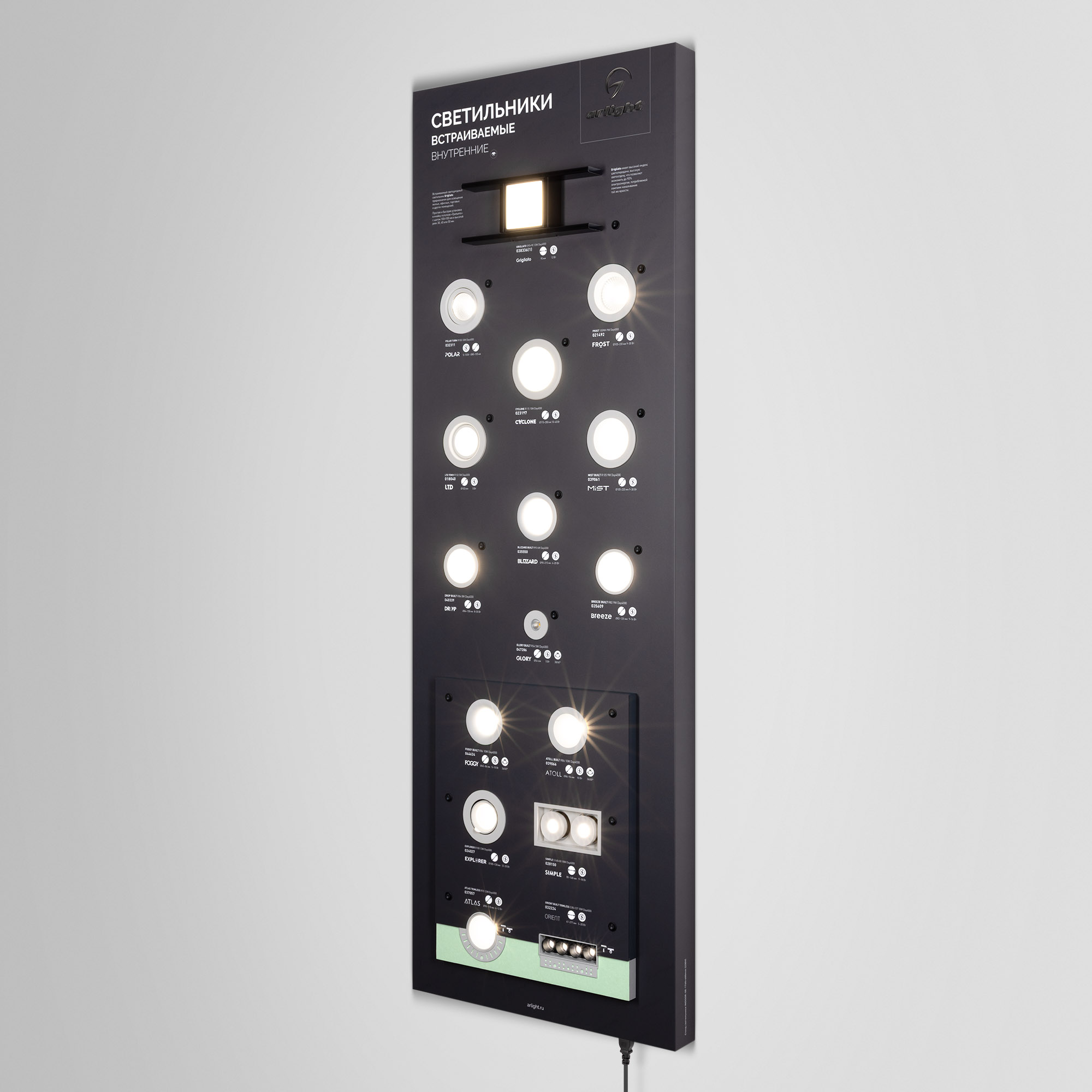На стенде представлены самые ходовые модели даунлайтов серий FROST, CYCLONE, BREEZE, POLAR, DROP, LTD, BLIZZARD, MIST, EXPLORER, SIMPLE, ATLAS TRIMLESS, ORIENT BUILT TRIMLESS, GRIGLIATO, GLORY, FOGGY, ATOLL.