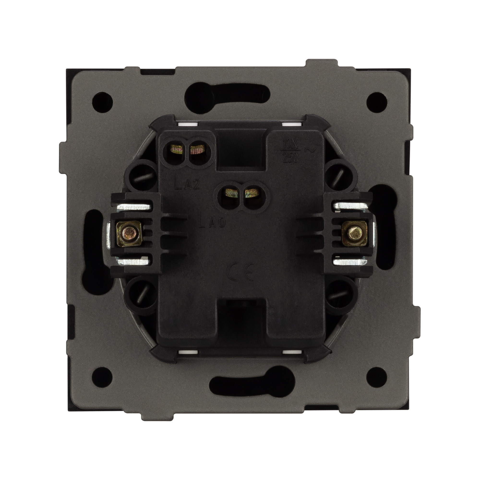 Контактная часть присоединяется при помощи винтовых зажимов, позволяя надежно подсоединить механизм выключателя к питающим элементам. А усиленные распорные лапки двойного захвата надежно фиксируют механизм в установочном подрозетнике круглого сечения диаметром 60мм.
