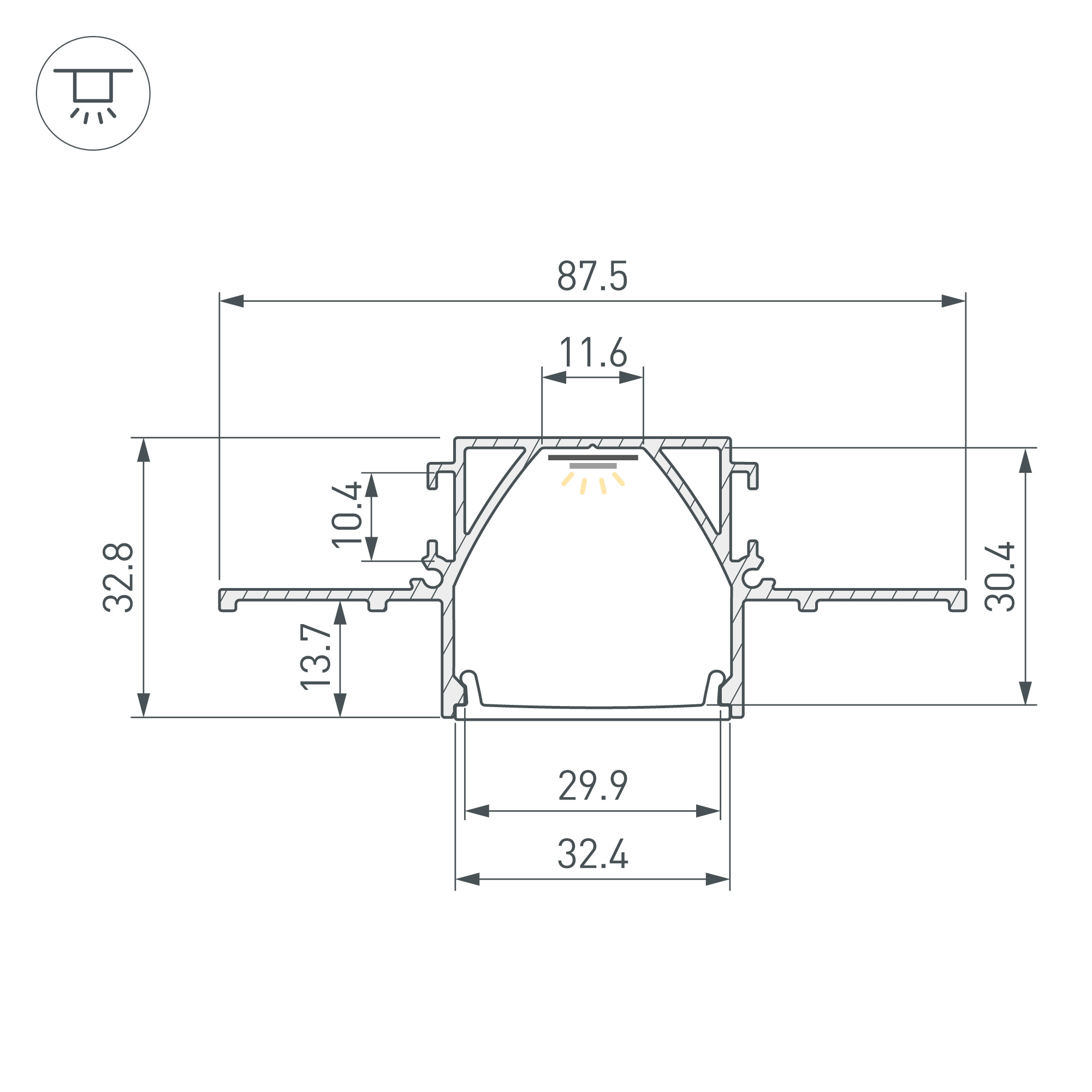 Алюминиевый анодированный профиль для светодиодных лент и линеек. Габаритные размеры (L×W×H): 2000x87,5х32,8 мм. Ширина площадки для ленты 11,6 мм. Экраны, заглушки и другие аксессуары приобретаются отдельно. Цена за 1 метр.