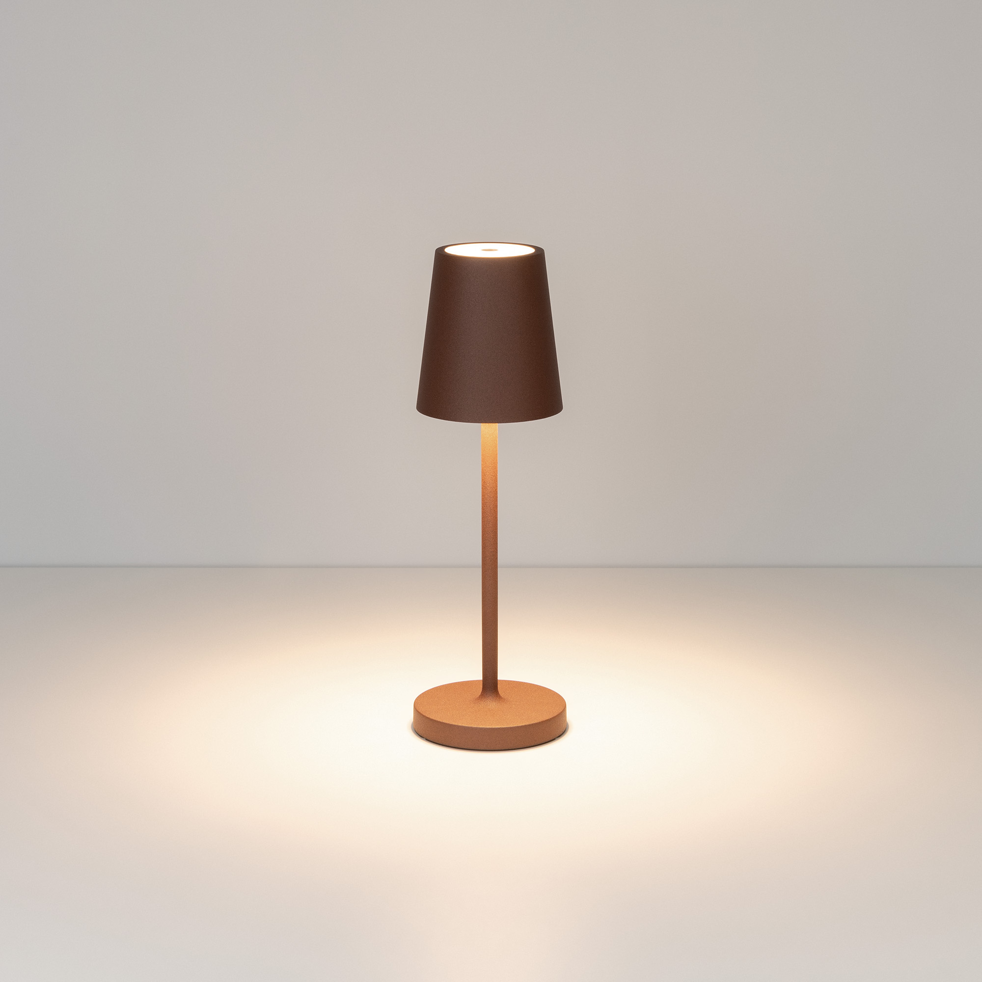 Настольный светильник со встроенным аккумулятором 1.5Вт, алюминиевый корпус, цвет терракотовый. Цвет ТЕПЛЫЙ БЕЛЫЙ 2200-2700-3000K, св.поток 110-130 лм, CRI(Ra)>80, угол 90°. Размер Ф75x250мм. IP54. Зарядка от сети переменного тока AC220-240V. Тип встроенного аккумулятора 1500мАч Li-ion, напряжение батареи 3.7V
