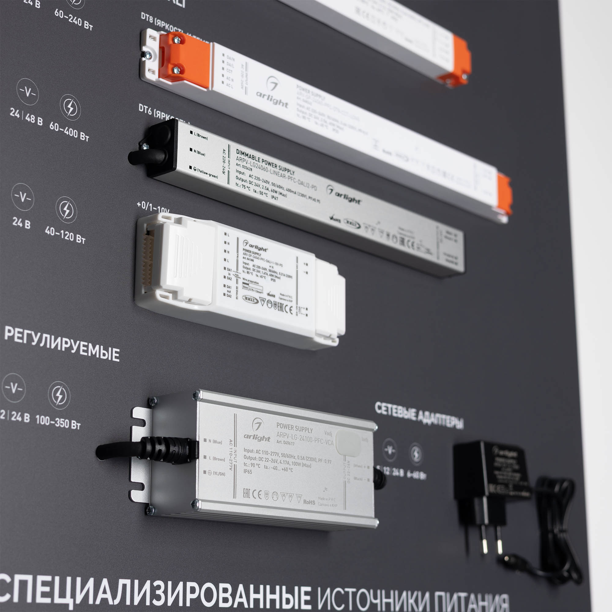 На стенде представлен широкий ассортимент блоков питания Arlight для различных источников освещения: светодиодные ленты, светильники, мощные светодиоды и т. п. Показаны варианты встройки блоков питания в ниши и в профиль. Реализован механизм плавного включения светодиодной ленты.