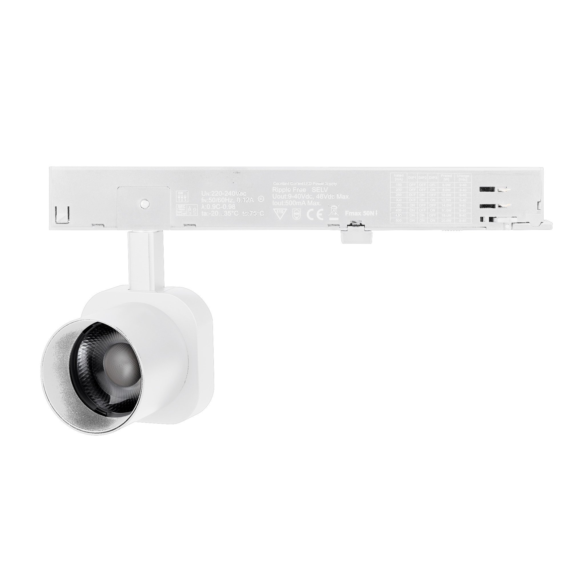 Светильник для треков/шин 4 провода. Мощность 10 Вт, св. поток 860 лм, 86 лм/Вт, дневной 4000 K, CRI>95, угол 38°, напряжение питания 230 В. Решетка HONEYCOMB в комплекте. Белый квадратный корпус из алюминия, материал линзы PC поликарбонат, степень защиты IP20. Размер световой части 60х60х62 мм. Монтаж на трек 3-фазный. Драйвер встроенный 9-40 В, 250мА., пульсация <1%
