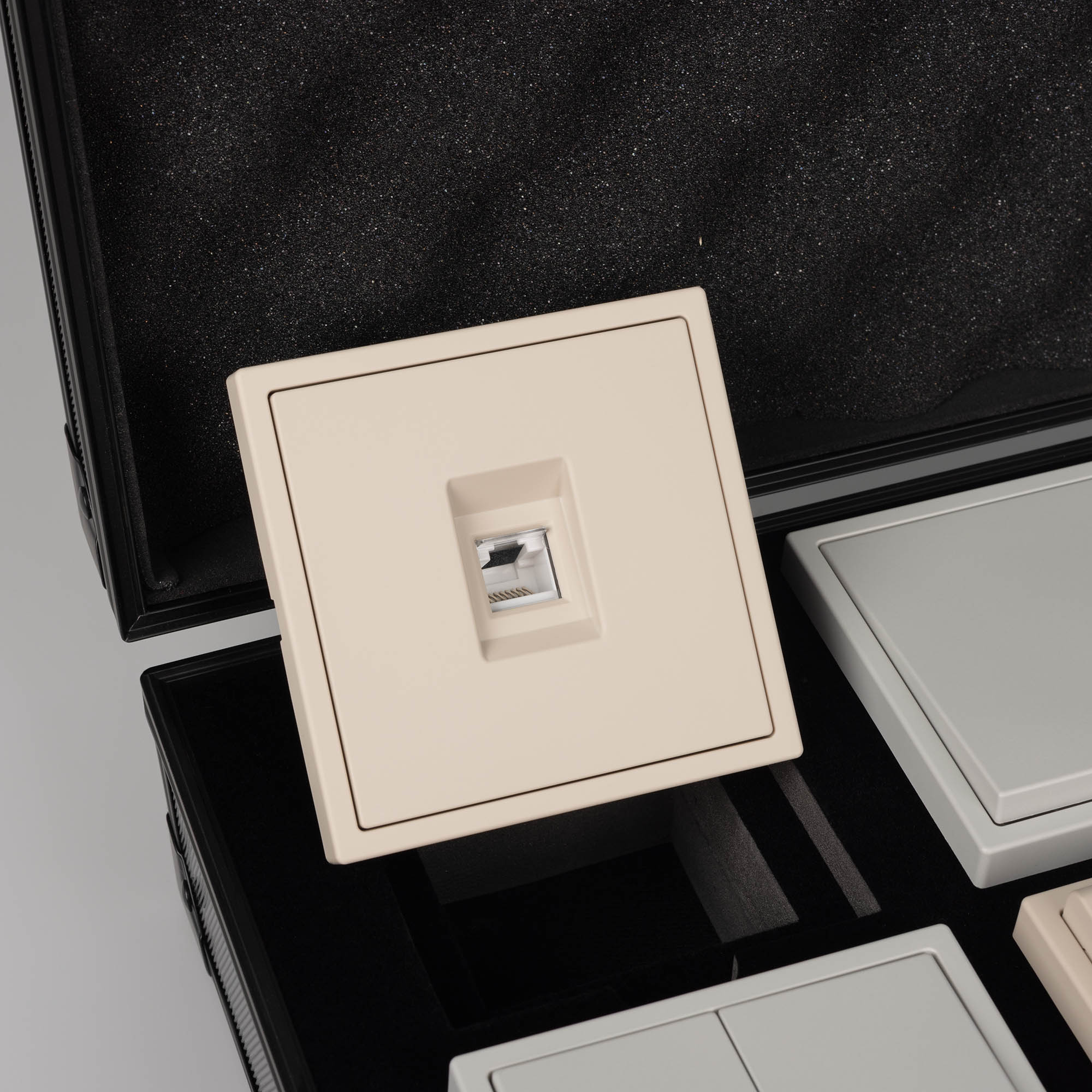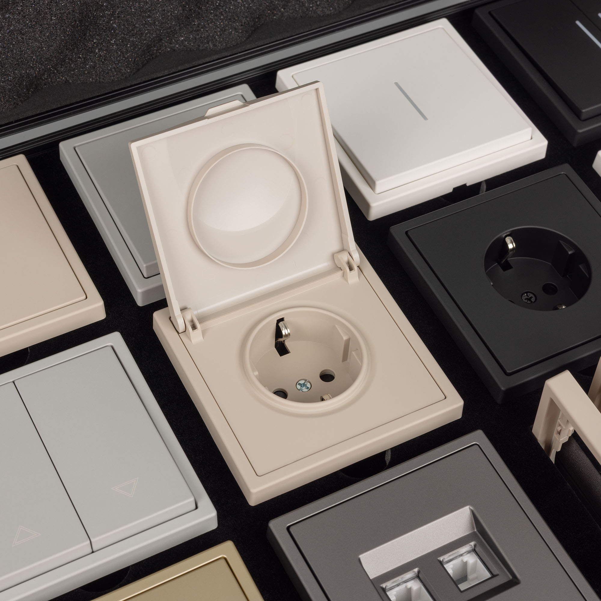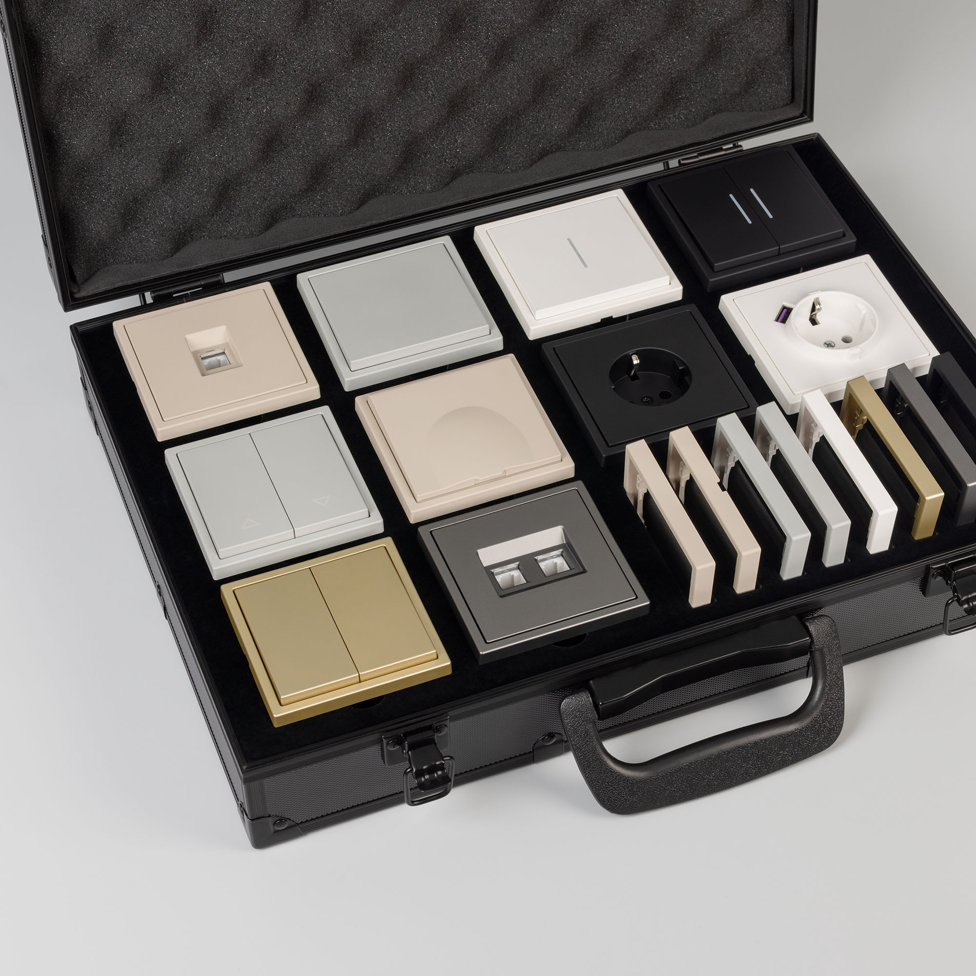 Рамки серии NOBE в цветах Белый кварц, Черный оникс, Золотой песок и Серый базальт. Поверхность рамок имеет Soft-Touch покрытие: