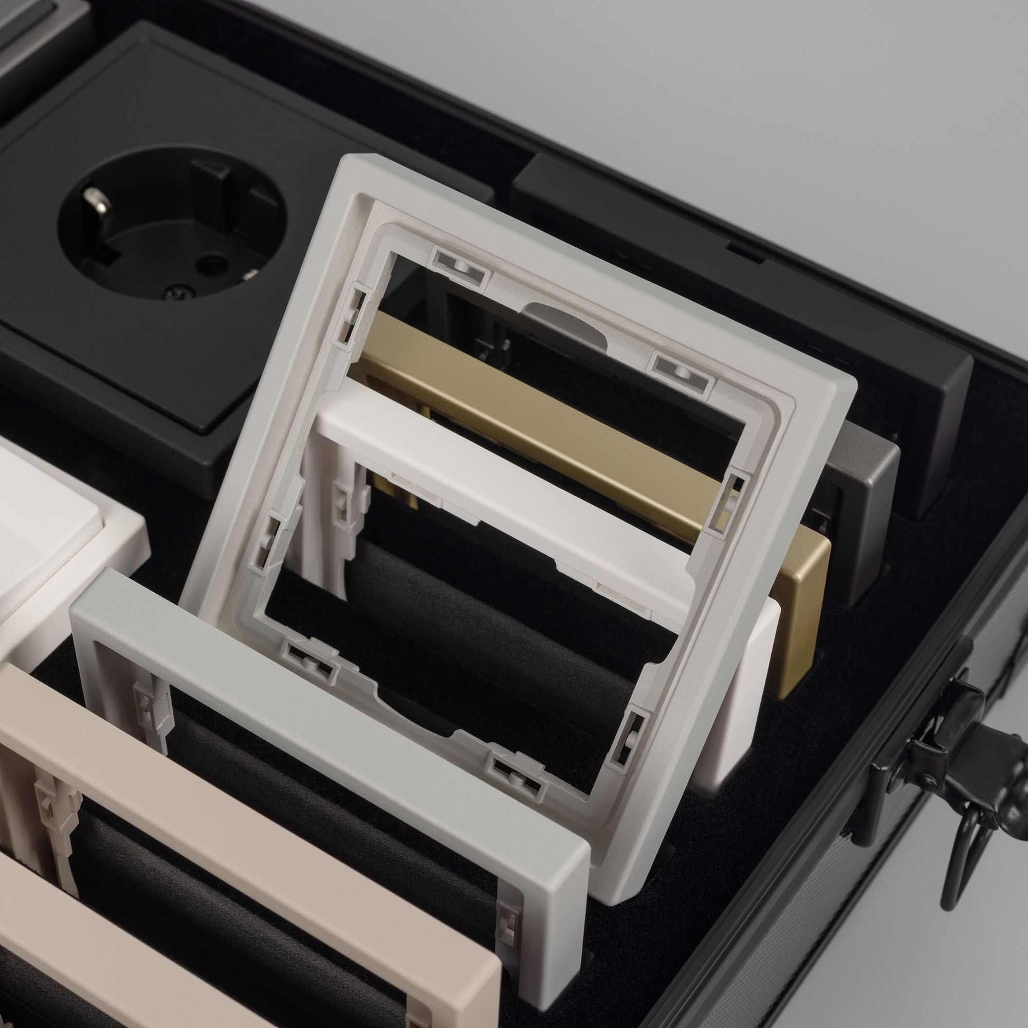Рамки серии NOBE в цветах Белый кварц, Черный оникс, Золотой песок и Серый базальт. Поверхность рамок имеет Soft-Touch покрытие: