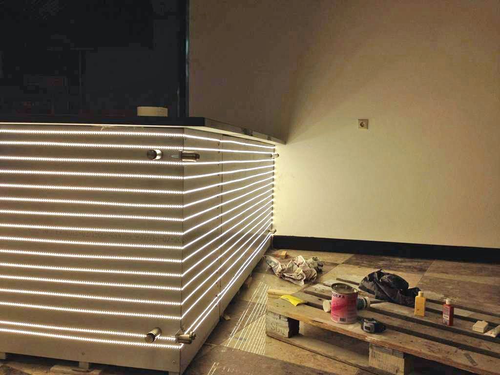 Для подсветки первой барной стойки использовалась светодиодная лента с тёплым белым свечением, для подсветки второй - с "чистым" белым. После монтажа светодиодных лент на барные стойки были установлены белые матовые стёкла.